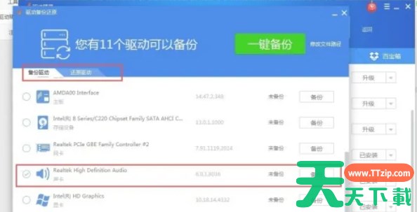在弹出的窗口中,可单独备份或 批量选择驱动 备份。备份完成后,声卡驱动状态会显示 “已备份”。