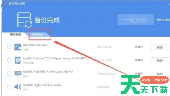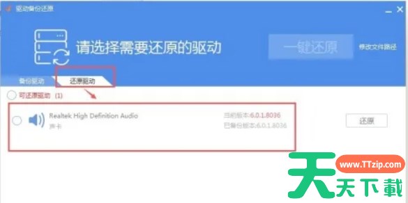 在驱动管理界面,点击顶部的 【还原驱动】 选项卡。在列表中找到 已备份的声卡驱动(按设备名称或日期筛选)。