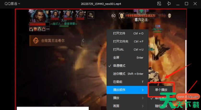 QQ影音是一款专业性的本地播放器,那么QQ影音怎么设置单个播放?QQ影音设置单个播放的方法?下面就让天天下载Ttzip给大家解答下吧! QQ影音怎么设置单个播放? 1、打开QQ影音,右键点击播放页面。 2、然后跳出的页面中,点击“播放顺序”,勾选页面中的“单个播放”即可。 以上就是天天下载Ttzip为您整理的QQ影音怎么设置单个播放?qq影音设置单个播放的方法啦,希望能帮到您。 除特别注明外,本站所有文章均为 天天下载 原创,转载请注明出处来自 https://www.ttzip.com/208556.html