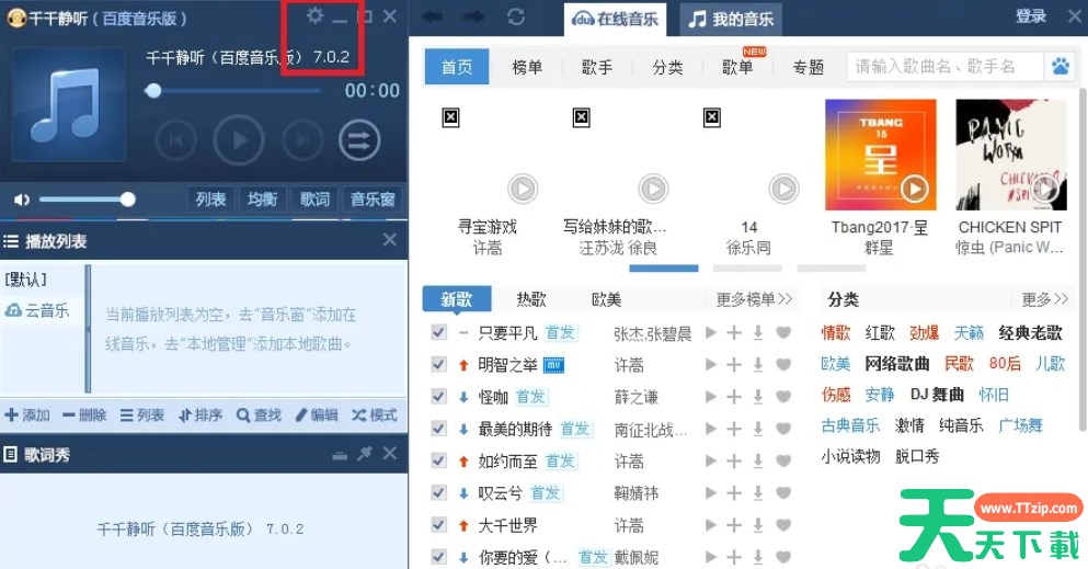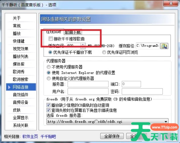 千千静听(TTPlayer)集播放、音效、转换、歌词等众多功能于一身,小巧精致、操作简捷,那么千千静听怎么设置不接收推荐歌曲?千千静听设置不接收推荐歌曲的方法?下面就让天天下载Ttzip给大家解答下吧! 千千静听怎么设置不接收推荐歌曲? 1、打开千千静听主界面,点击左上角的“设置”选项。 2、在“网络连接”的选项中,将“接收千千静听推荐歌曲”前面的勾选去掉后保存即可。 以上就是天天下载Ttzip为您整理的千千静听怎么设置不接收推荐歌曲?千千静听设置不接收推荐歌曲的方法啦,希望能帮到您。 除特别注明外,本站所有文章均为 天天下载 原创,转载请注明出处来自 https://www.ttzip.com/208571.html