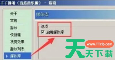 千千静听是一款小巧精致、操作简捷、功能强大的特点的高清晰音质播放软件,那么千千静听怎么启用媒体库?千千静听启用媒体库的方法?下面就让天天下载Ttzip给大家解答下吧! 千千静听怎么启用媒体库? 1、在千千静听主界面中,鼠标右键点击空白区域,在弹出的菜单中选择“选项”进入设置界面。 2、在“选项”设置界面中,找到并点击左侧的“媒体库”选项,在“媒体库”设置项下,勾选“启用媒体库”选项即可。 以上就是天天下载Ttzip为您整理的千千静听怎么启用媒体库?千千静听启用媒体库的方法啦,希望能帮到您。 除特别注明外,本站所有文章均为 天天下载 原创,转载请注明出处来自 https://www.ttzip.com/208577.html