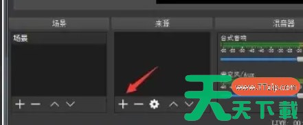 打开 OBS Studio 后,在界面底部找到 “来源” 面板。点击 “+”(加号) 按钮,弹出来源选择菜单。