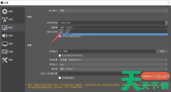 在输出设置页面中,找到 “流” 或 “录像” 部分的 “编码器” 下拉菜单。