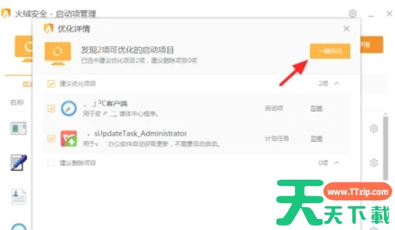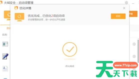 点击页面上的“一键优化”按钮,火绒会自动禁用不必要的自启动项。