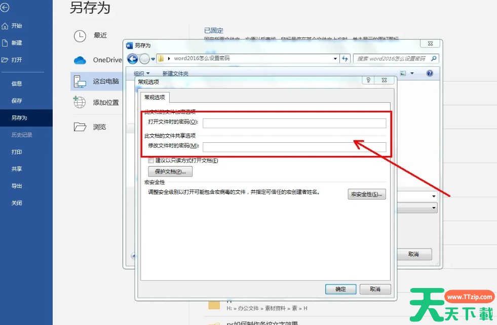 在常规选项设置栏中,你会看到两个密码输入框:一个用于设置“打开文件时的密码”,另一个用于设置“修改文件时的密码”(可选)。