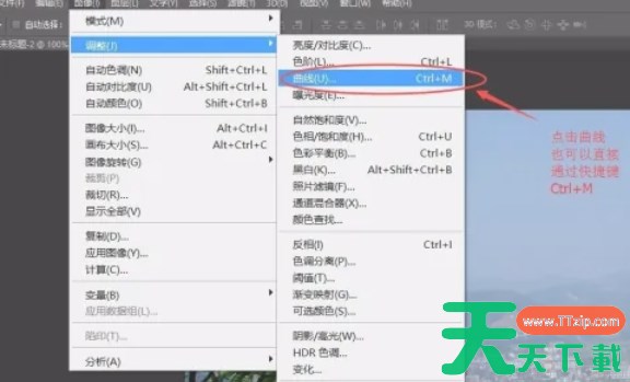 点击“图像”→“调整”→“曲线”(快捷键:Ctrl+M或Cmd+M)。