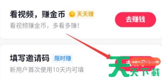 在“来赚钱”页面中,向下滑动或浏览页面,你会找到【填写邀请码】的选项。它可能直接显示为一个按钮,或者需要点击某个区域(如“去填写”或“立即填写”等)来进入填写邀请码的界面。