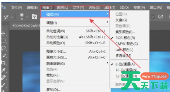 在Photoshop界面上方的菜单栏中,点击“图像”(Image)。在下拉菜单中,找到并点击“模式”(Mode)选项。