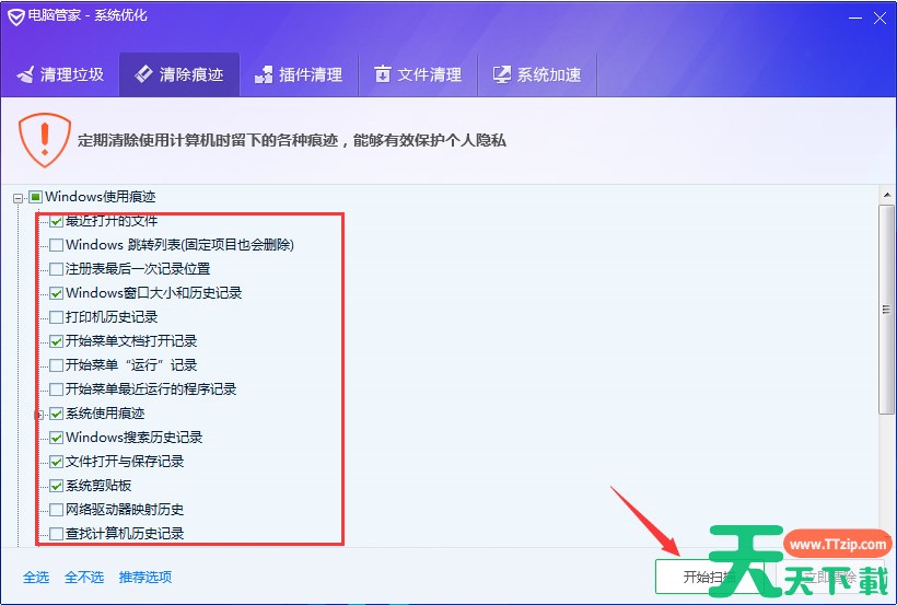3.选取痕迹的类型,并按下“开始扫描”按钮,如下图所示。
