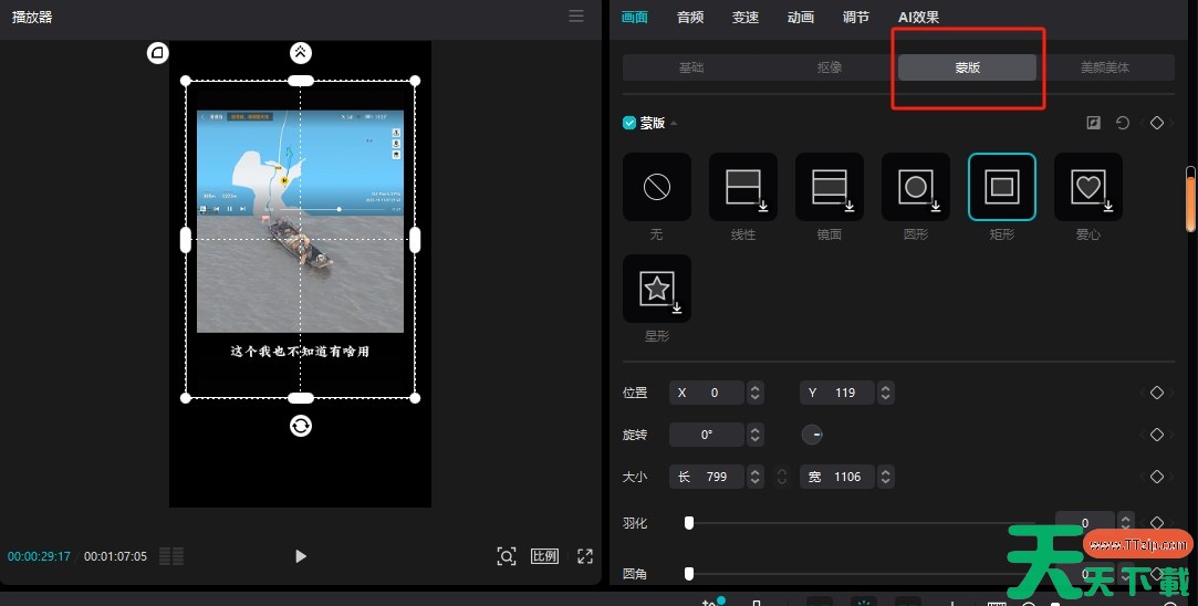 方法三:添加蒙版,并给蒙版添加模糊效果,使蒙版更自然导入视频,并将视频拖放到时间线上。复制一份原素材,放在上层。点击工具栏里的矩形蒙版,将矩形蒙版放置在有水印的地方。接着再点击特效里的模糊效果,使水印部分变得模糊。