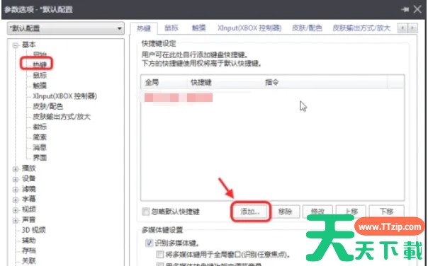 在选项窗口中,点击左侧 【热键】 → 【添加】。在 【新建热键功能菜单】 中,选择 【视频】→【图片截取】。