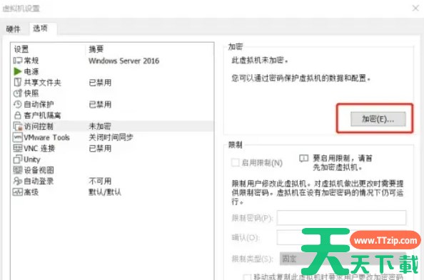加密完成后,在“限制”选项框中,您可以勾选“启用限制”复选框。输入一个“限制密码”,这个密码将用于进一步限制对虚拟机的访问和修改。点击“确定”按钮保存设置。