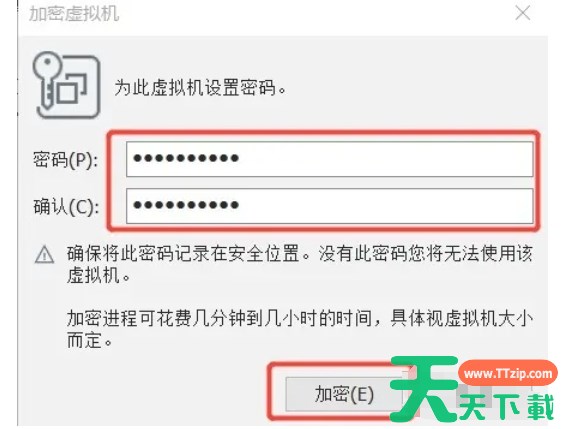 在弹出的“加密虚拟机”窗口中,输入您想要使用的密码。为了确保密码的准确性,您还需要再次输入密码进行确认。