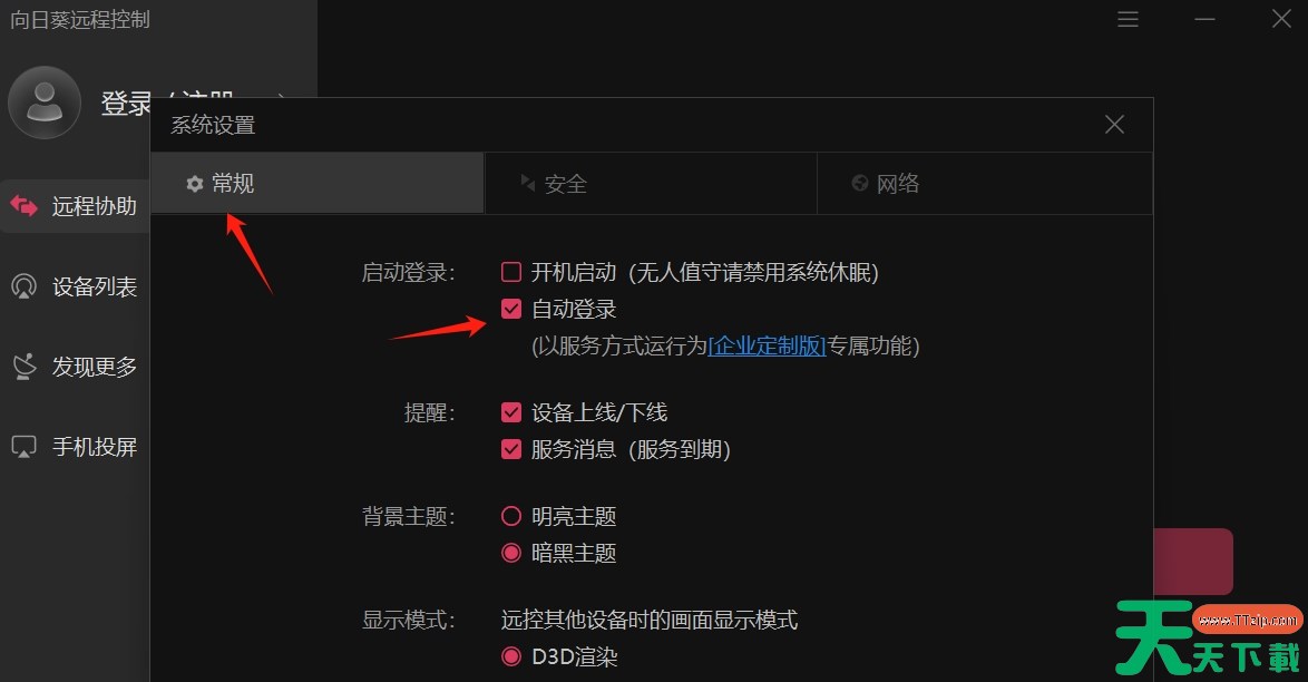 向日葵客户端是一款电脑远程控制软件,那么向日葵客户端怎么设置自动登录?向日葵客户端设置自动登录的方法?下面就让天天下载Ttzip给大家解答下吧! 向日葵客户端怎么设置自动登录 1、进入向日葵客户端的主界面后,点击右上角的三道杠图标,在弹出的菜单中,选择“设置”选项。 2、在设置界面中,找到并点击“常规”选项,在常规设置页面中,找到“启动登录”选项,勾选“自动登录”复选框即可。 以上就是天天下载Ttzip为您整理的向日葵客户端怎么设置自动登录?向日葵客户端设置自动登录的方法啦,希望能帮到您。 除特别注明外,本站所有文章均为 天天下载 原创,转载请注明出处来自 https://www.ttzip.com/208813.html