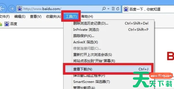 在打开的ie10浏览器中,单击菜单栏上的“工具”选项。在下拉菜单中,选择“查看下载”选项。这将打开“查看下载”窗口,显示已下载文件的列表。