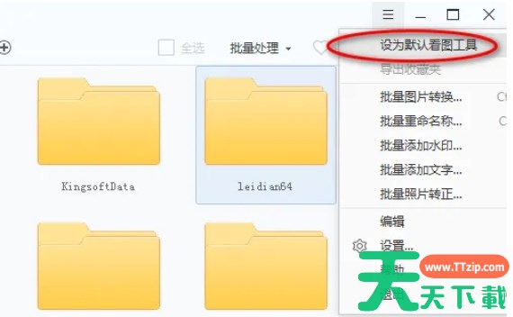 2345看图王是一款简单好用的高清看图软件,那么2345看图王怎么设置默认看图工具?2345看图王设置默认看图工具的方法?下面就让天天下载Ttzip给大家解答下吧! 2345看图王怎么设置默认看图工具? 1、在软件窗口的右上角或左上角,找到并点击三条横线的设置图标。 2、在弹出的菜单中,选择“设为默认看图工具”选项即可。 以上就是天天下载Ttzip为您整理的2345看图王怎么设置默认看图工具?2345看图王设置默认看图工具的方法啦,希望能帮到您。 除特别注明外,本站所有文章均为 天天下载 原创,转载请注明出处来自 https://www.ttzip.com/208871.html