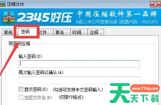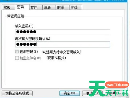 在经典模式界面中,点击“密码”选项卡。勾选“加密文件名”(可选,增强安全性)。输入并确认密码(建议密码包含字母、数字及符号,长度≥8位)。