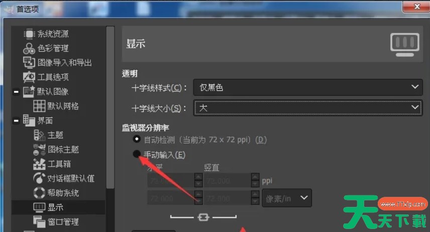在【显示】选项下,找到【手动输入】选项,并勾选它。这通常用于启用或禁用GIMP中的某些手动输入功能。