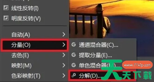 在“颜色”菜单下拉列表中,选择“分量”。在“分量”选项下,点击“分解”。