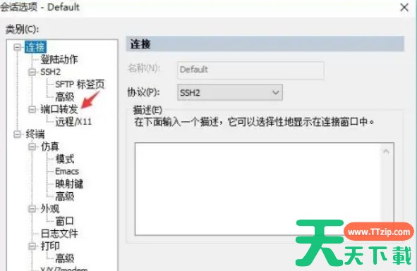 在编辑默认会话的设置界面中,找到并点击“端口转发”选项。这将打开端口转发的设置页面。
