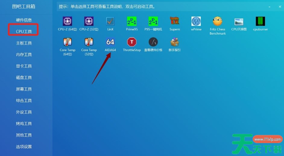 1、打卡图吧工具箱,在页面左侧选择“CPU”工具,然后点击AIDA64。