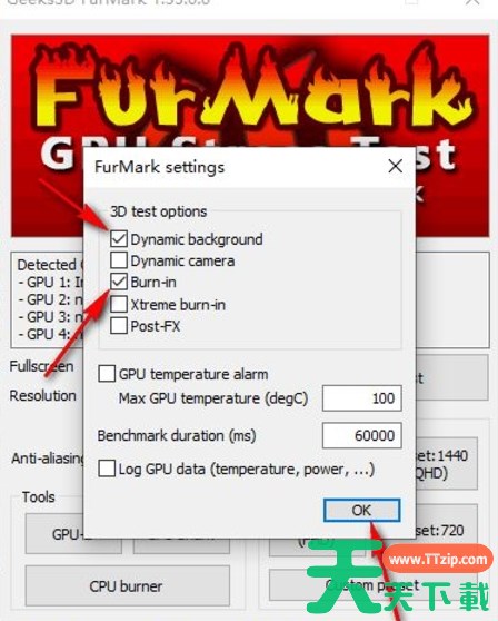 4、点击FurMark界面中的“Settings”按钮,在设置界面中,勾选“Full screen”(全屏)和“Burn-in test”(烤机测试)两个选项,点击“OK”按钮保存设置。