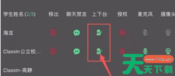 当课程开始时,点击页面上的“上下台”功能按钮。这将打开一个包含所有当前在课程中的学生或教师的列表页面。