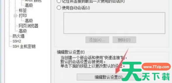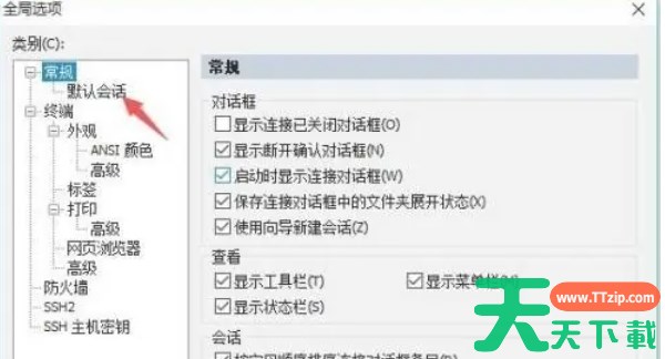 在全局选项界面中,找到并点击“默认会话”以编辑默认会话设置。