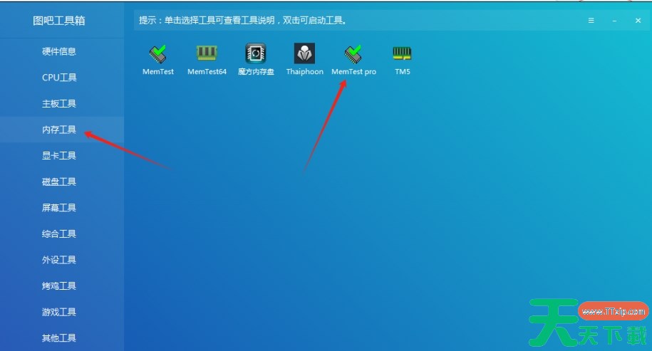 1、打开图吧工具箱在页面左侧点击“内存工具”分类,打开内存测试软件。