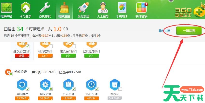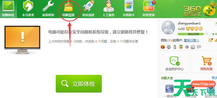 在此目录下搜索Packet.dll、npf.sys、WanPacket.dll、wpcap.dl,若找到的话就删除,若找不到,打开360安全卫士,选择电脑清理。