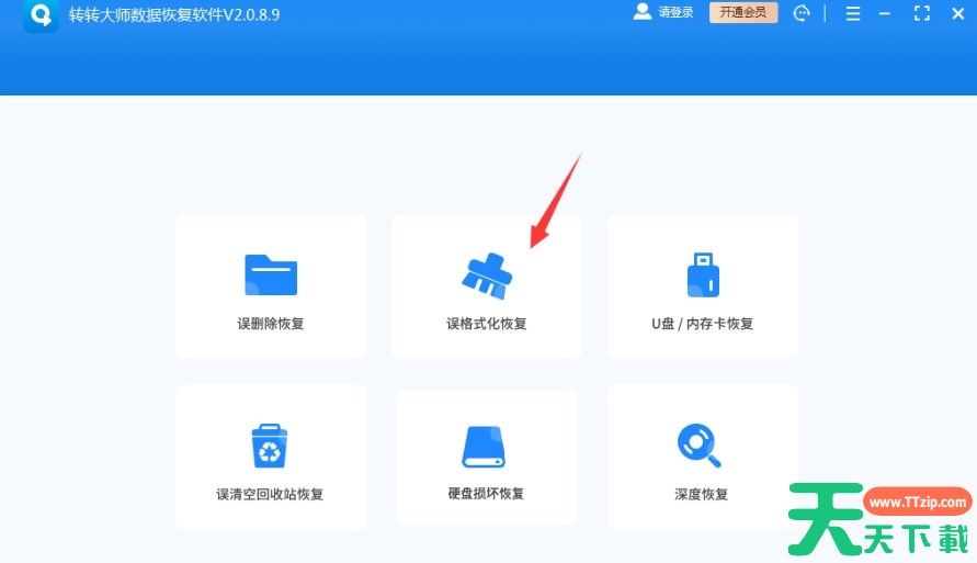 1、打开转转数据恢复大师,在软件界面中,选择“误格式化恢复”模式。