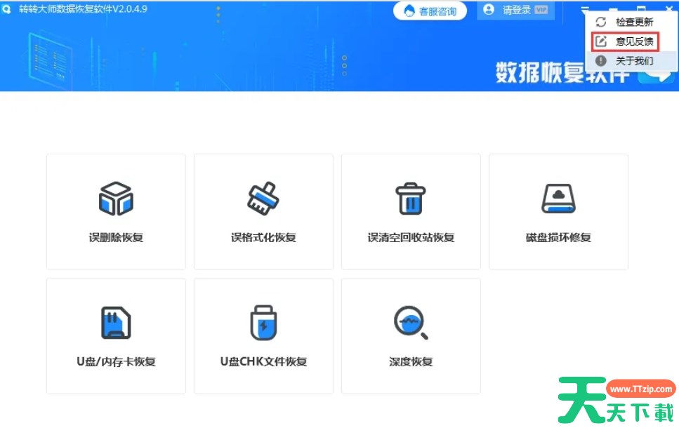 转转大师数据恢复是一款功能强大的数据恢复工具,那么转转数据恢复大师怎么进行意见反馈?转转数据恢复大师进行意见反馈的方法?下面就让天天下载Ttzip给大家解答下吧! 转转数据恢复大师怎么进行意见反馈? 1、打开转转数据恢复大师,在软件界面的右上角,找到并点击小箭头图标,以展开菜单。 2、在弹出的菜单中,选择“意见反馈”选项。 3、在意见反馈页面中,填写需要反馈的内容,然后再点击提交即可。 以上就是天天下载Ttzip为您整理的转转数据恢复大师怎么进行意见反馈?转转数据恢复大师进行意见反馈的方法啦,希望能帮到您。 除特别注明外,本站所有文章均为 天天下载 原创,转载请注明出处来自 https://www.ttzip.com/209025.html