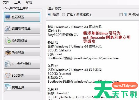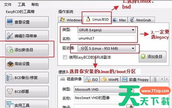 打开easybcd,添加新条目。按照天天下载Ttzip的标识操作。