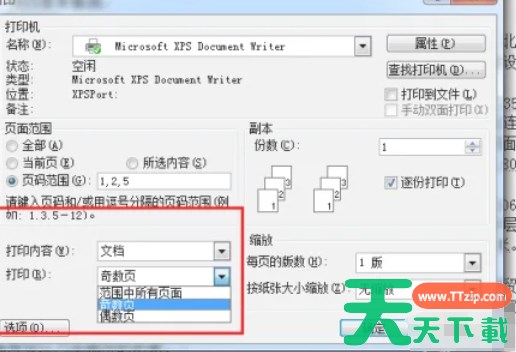 在“打印”下拉菜单中,可以选择“奇数页”或“偶数页”进行打印。