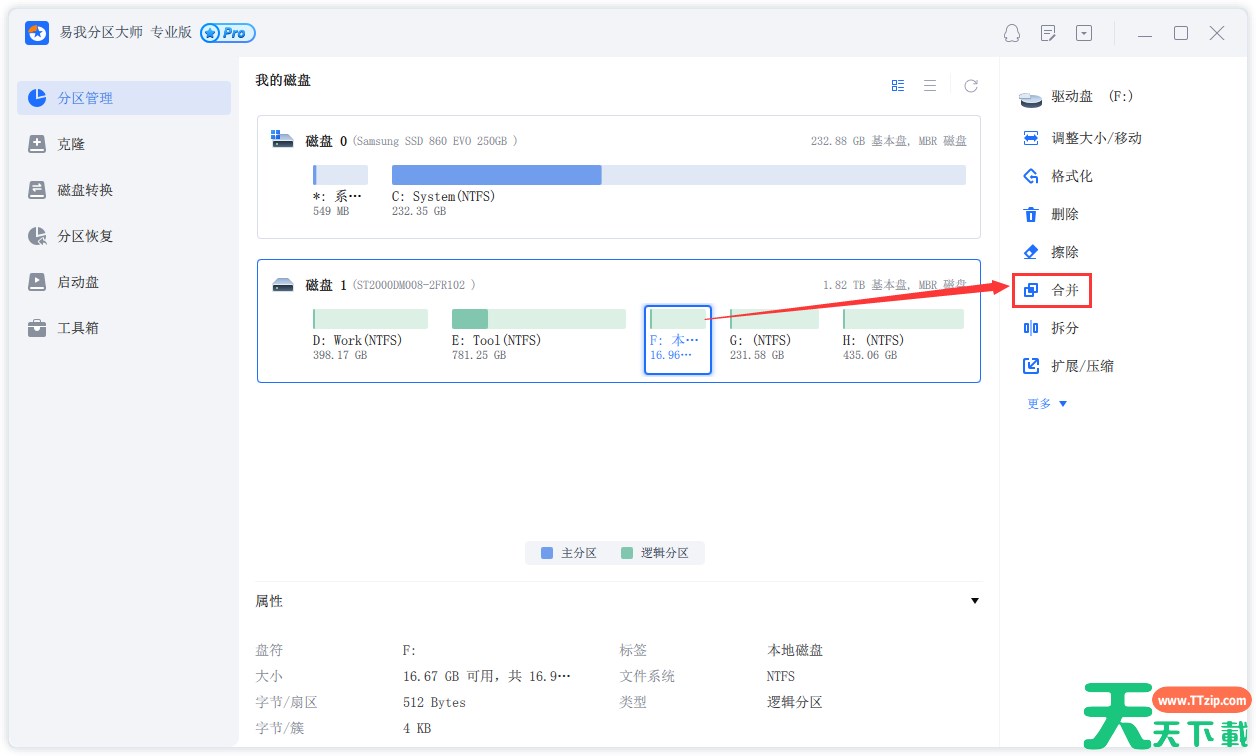 首先在易我分区大师(EaseUS Partition Master Professional)中选择一个分区,然后从右侧的功能列表中点击“合并”。