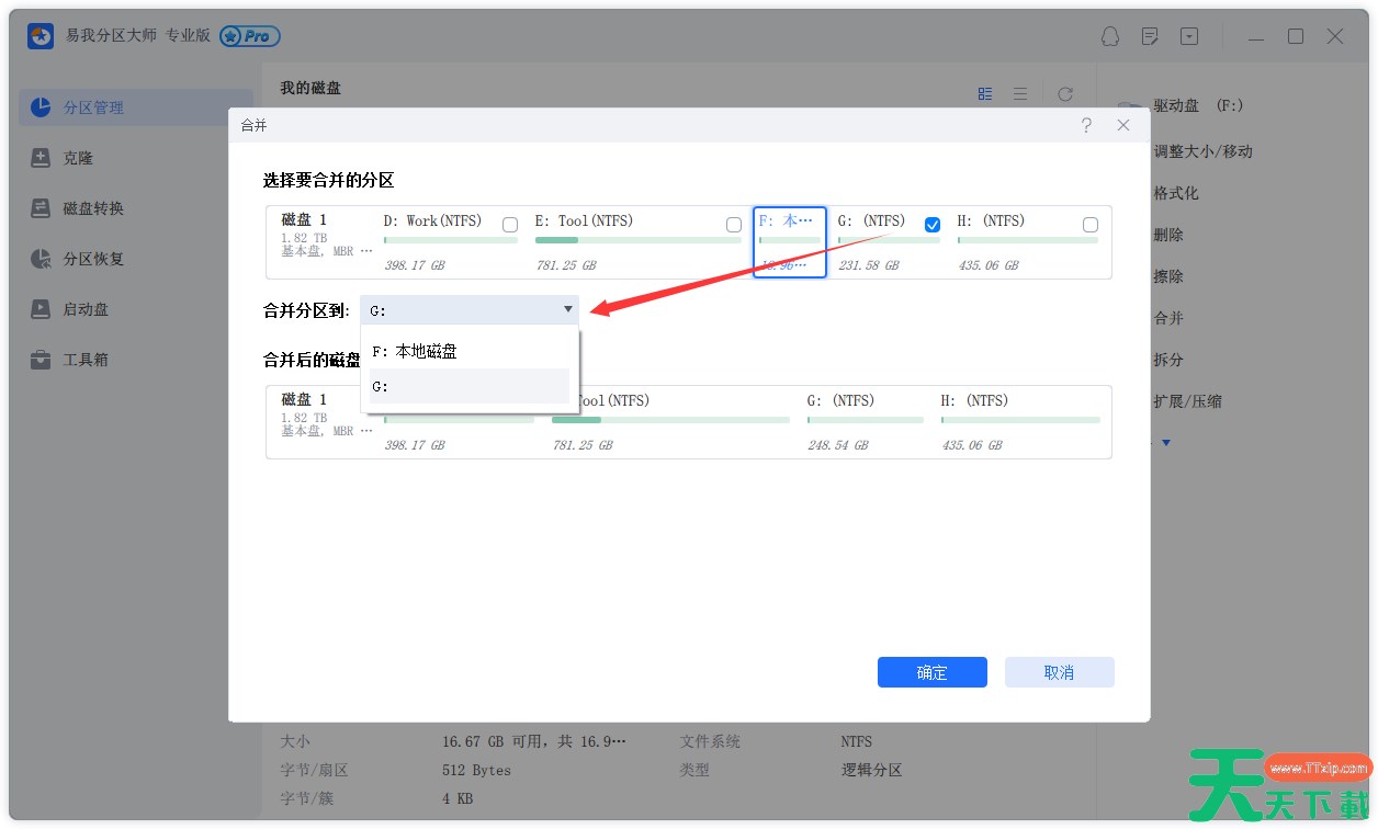 选择一个要合并的相邻分区,将空间合并到2个指定分区中的1个。建议您将数据较少的分区合并到另一个分区,以节省时间和精力。合并之后,另一个分区上的所有内容将放置在结果联合分区上的文件夹中。