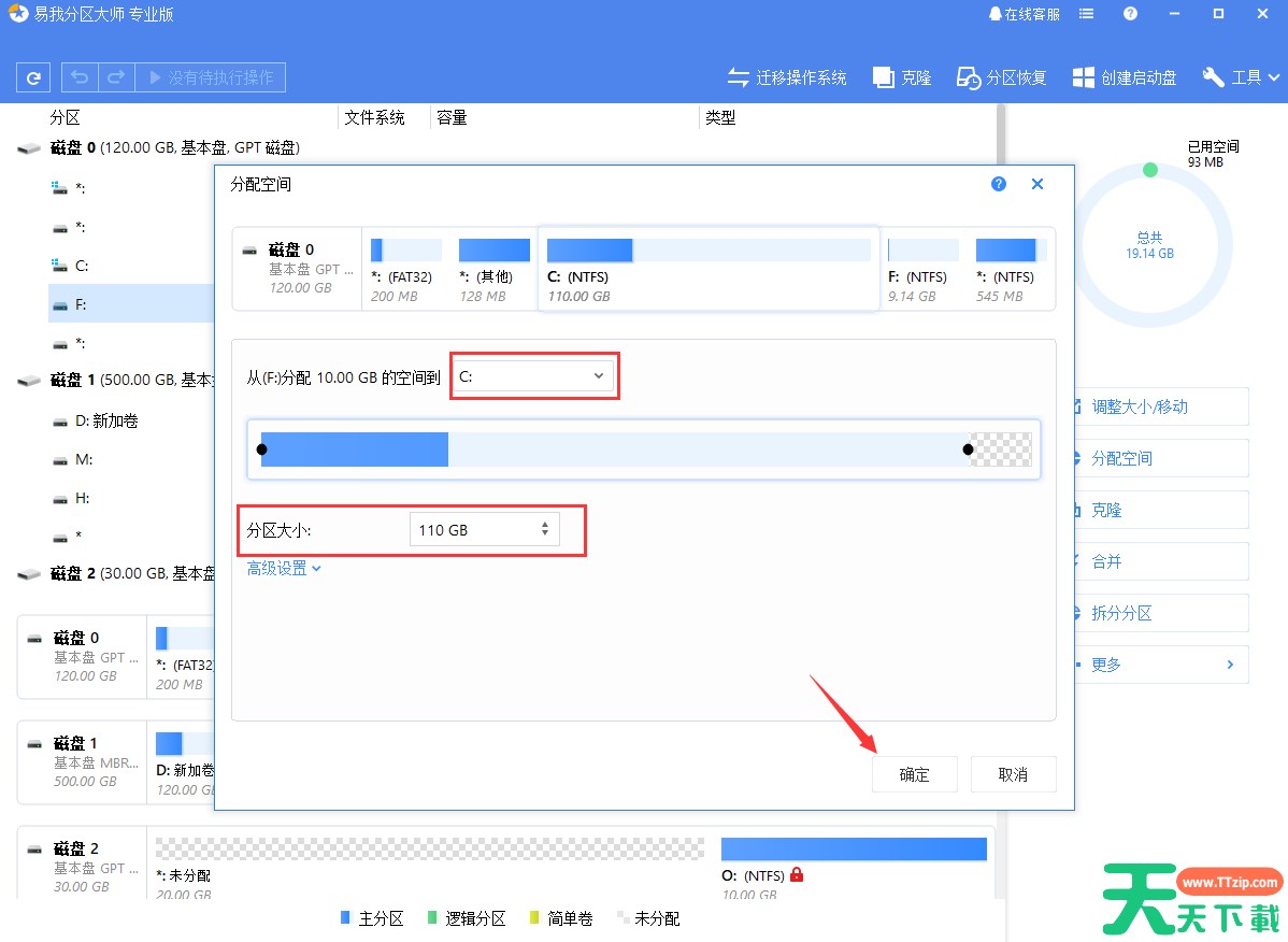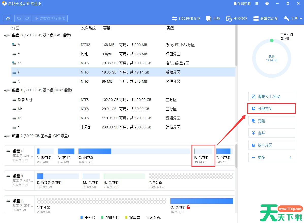 首先通过易我分区大师(EaseUS Partition Master Professional)在磁盘上选择一个分区,然后从功能列表中点击“分配空间”。