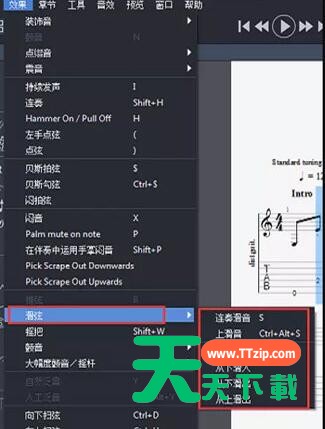 有很多朋友会被Guitar Pro设置滑音的操作困惑住,所以天天下载Ttzip就带来了Guitar Pro设置滑音的操作教程,感兴趣的朋友就跟天天下载Ttzip一起来学习一下吧。Guitar Pro设置滑音的操作流程讲解首先点击【效果】-【滑弦】”,接下来就在菜鸟中选择“上滑”或者“连音滑”都是从滑弦的第一个音开始 点击滑弦自动跳到第二个音。