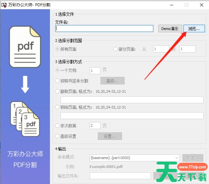 在弹出的PDF分割窗口中,点击“浏览”按钮。