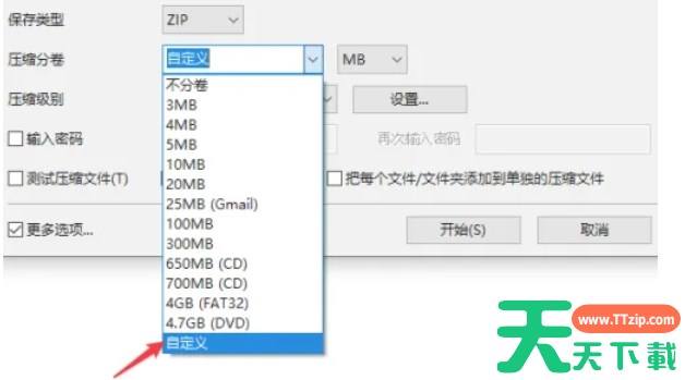 在“更多选项”中,找到“压缩分卷”设置。点击下拉列表,可以选择预设的分卷大小,如5MB、10MB等。如果预设大小不满足需求,可以选择“自定义”并手动输入所需的分卷大小。