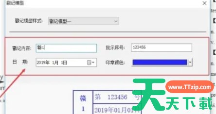 在戳记模型界面的下方,你将看到用于输入或编辑戳记内容的区域。在这里,你可以输入戳记的具体内容、批示序号、日期,并选择印章的颜色。