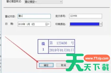 在完成戳记内容的编辑后,你可以在下方预览生成的戳记模型。如果预览效果满意,点击“确定”按钮以确认你的戳记设置。
