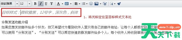 首先在“写邮件”窗口,把光标定位至目标样式文本处。