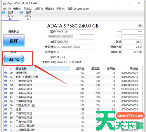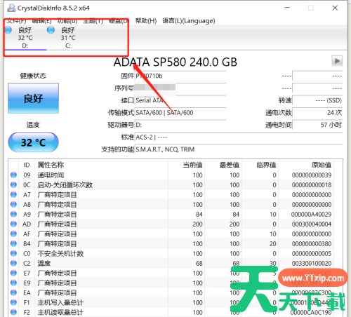 第一步:打开crystaldiskinfo,进入主界面,进入后,切换要设置报警的磁盘;