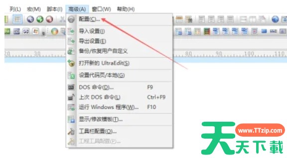 在“高级”下拉菜单中,找到并点击“配置”选项。这将打开UltraEdit的配置界面。