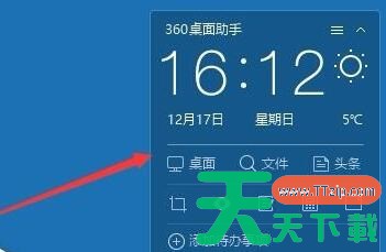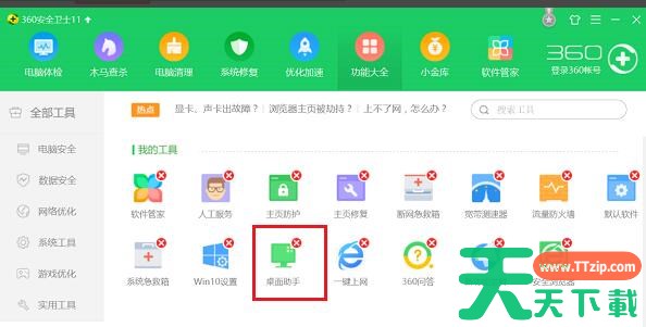 大家知道怎么在电脑上打开360桌面助手吗?其实很简单,下面天天下载Ttzip就和大家一起分享打开360桌面助手的方法,有需要的朋友可以来看看哦,希望可以帮助到大家。 首先,在电脑上打开360安全卫士,找到“桌面助理”的图标,点击该图标,就会自动下载并安装360桌面助手。 这时在桌面上就可以看到360桌面助手了。 以上就是天天下载Ttzip分享的打开360桌面助手的方法,有需要的朋友可以来看看这篇文章哦。 除特别注明外,本站所有文章均为 天天下载 原创,转载请注明出处来自 https://www.ttzip.com/209249.html