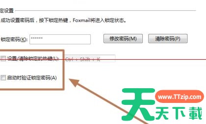 现在可为锁定邮箱设置一个快捷键,将前面打勾,也可设置启动Foxmail邮箱时需要输入锁定密码。