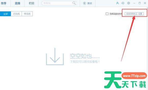 3、再在“我的下载”界面右上角找到“打开文件夹”和“设置”两个按钮;