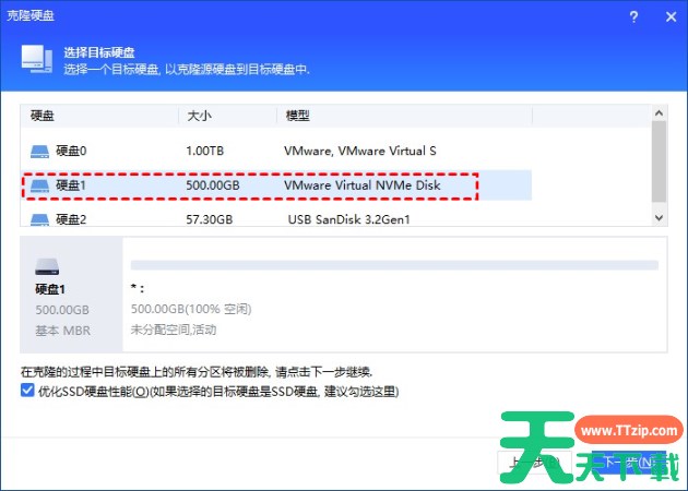 同样地,在列表中选择您想要作为克隆目标的硬盘,并再次点击“下一步”以确认选择。