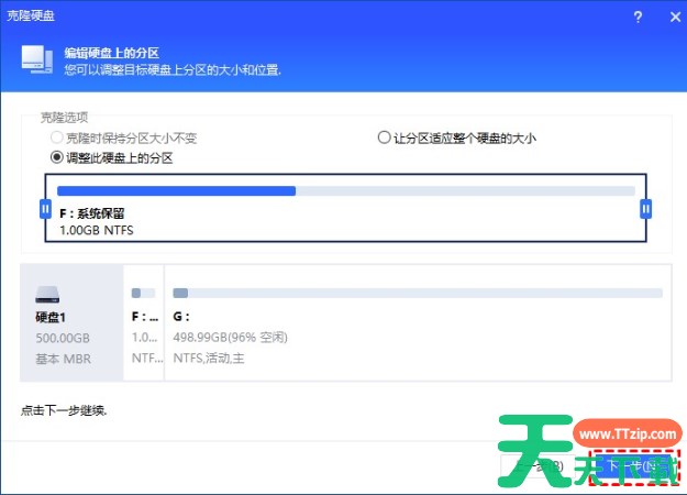 在接下来的步骤中,傲梅分区助手允许您根据需求调整目标硬盘的分区大小。您可以选择保持原分区大小、让分区自动适应整个硬盘,或手动调整各个分区的大小。完成设置后,请点击“下一步”。